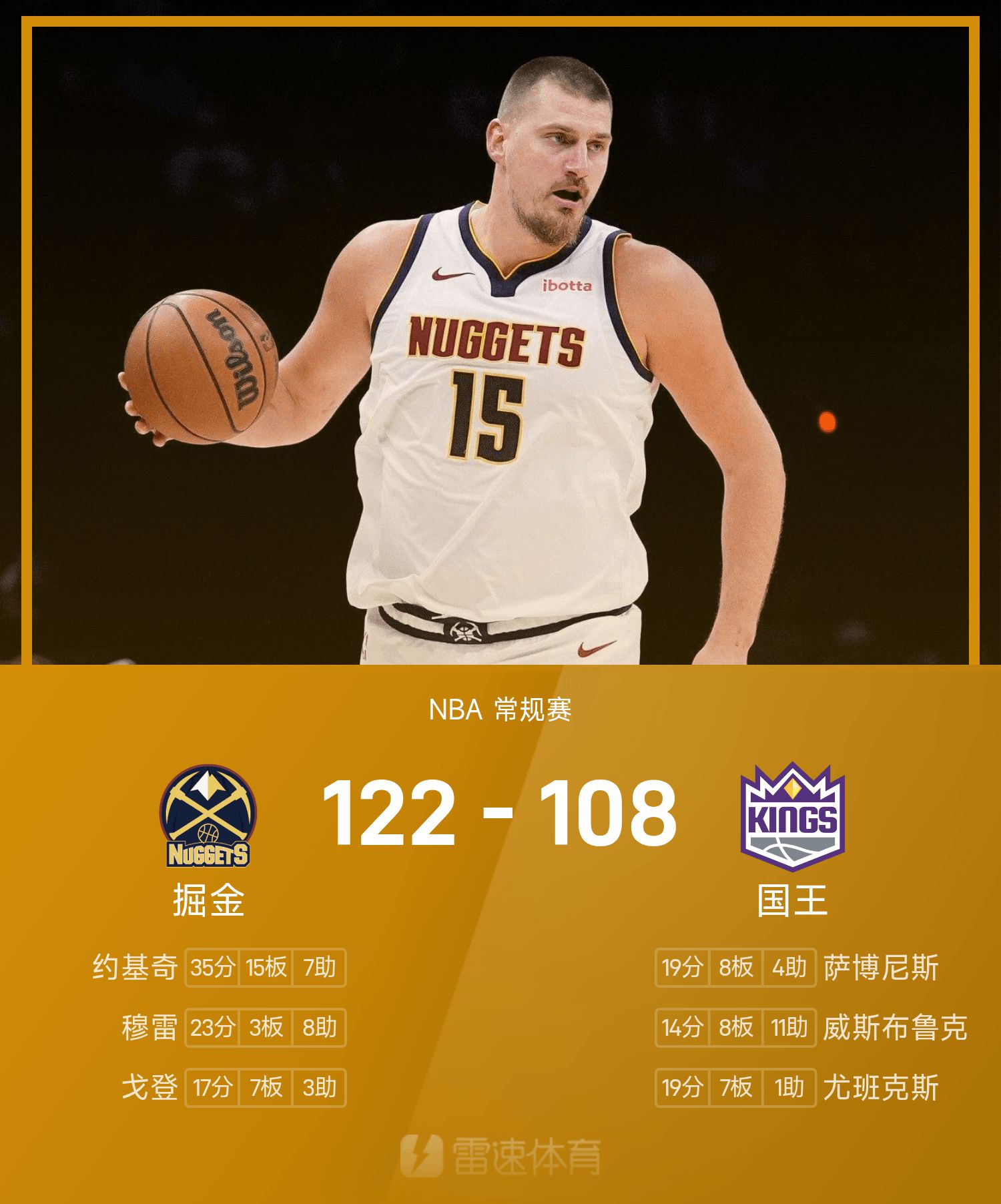 NBA战报:约基奇35分15板7助,掘金122-108击败国王