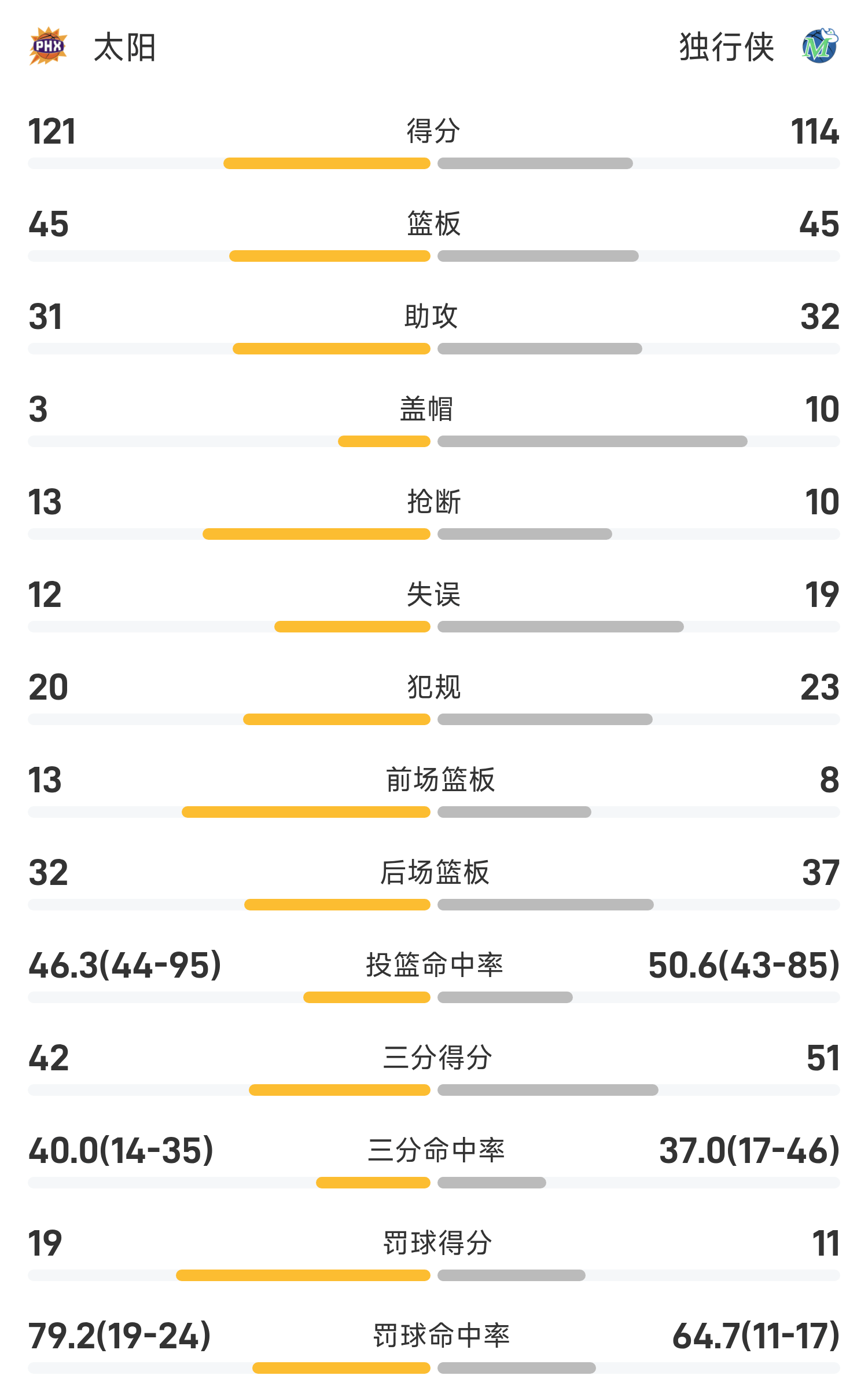 双方全场战罢,独行侠114-122不敌太阳。