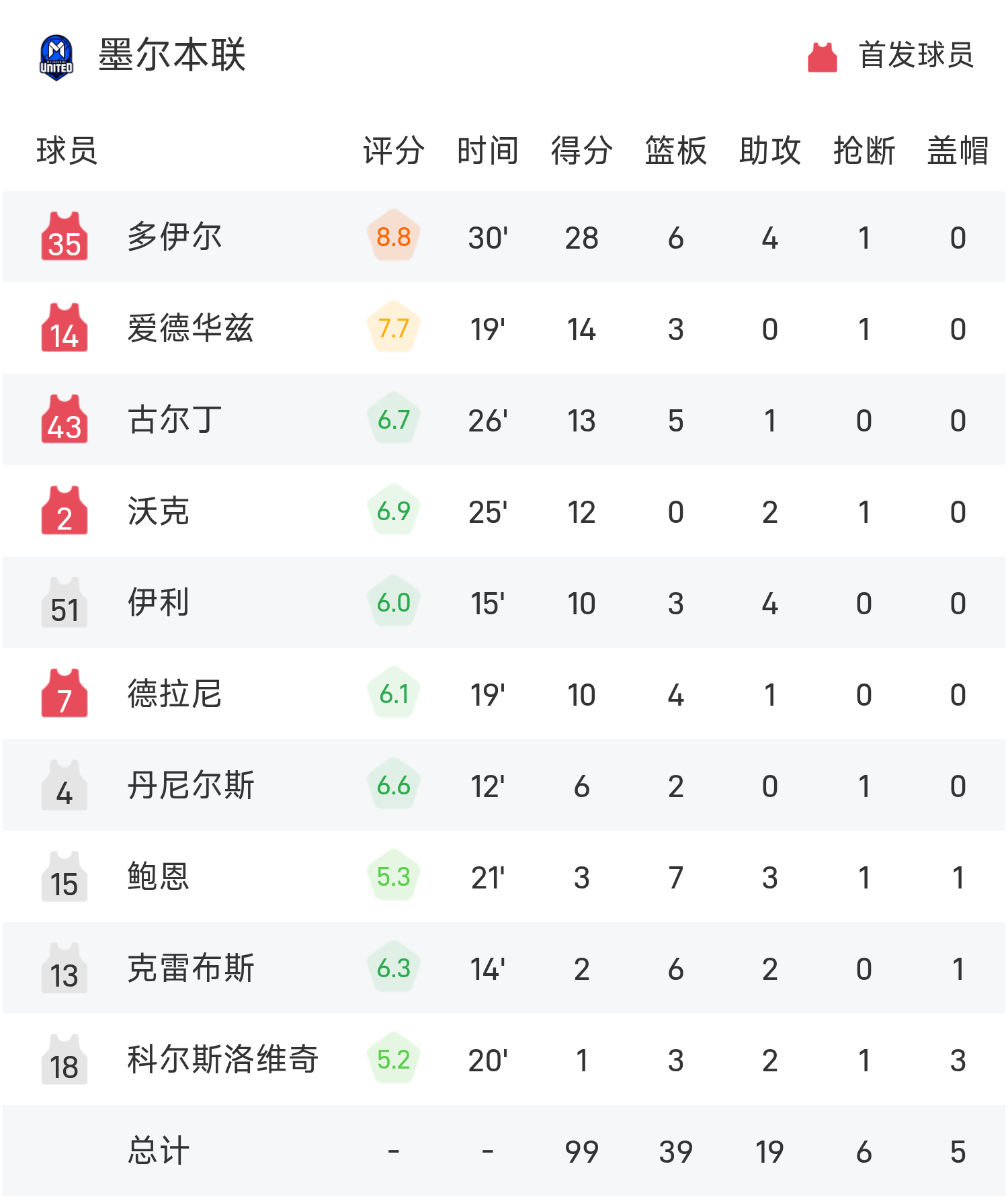 多伊尔砍下全场最高的28分6板4助,率领墨尔本联胜利取胜。