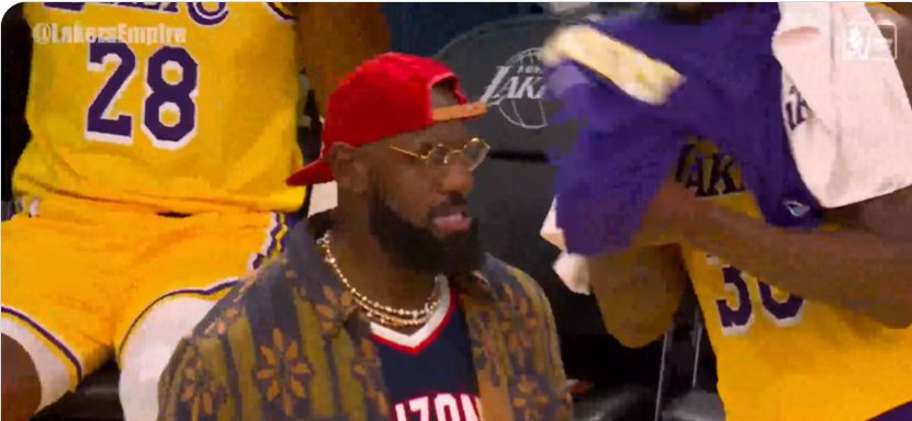 虽然因为受伤病无法出战,但是勒布朗仍然不停和场上的队友沟通,积极互动。