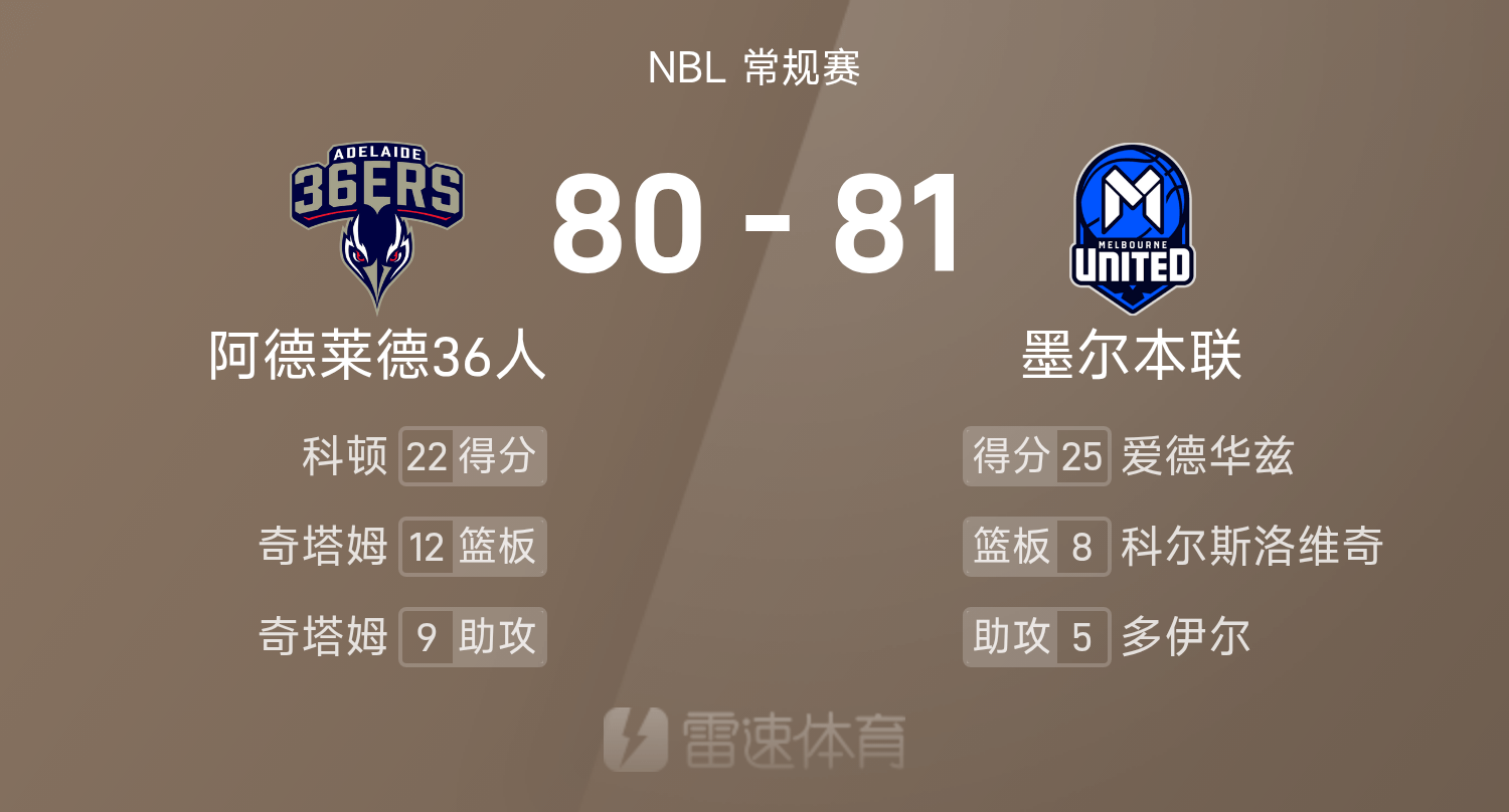 双方全场战罢,墨尔本联81-80战胜阿德莱德36人。