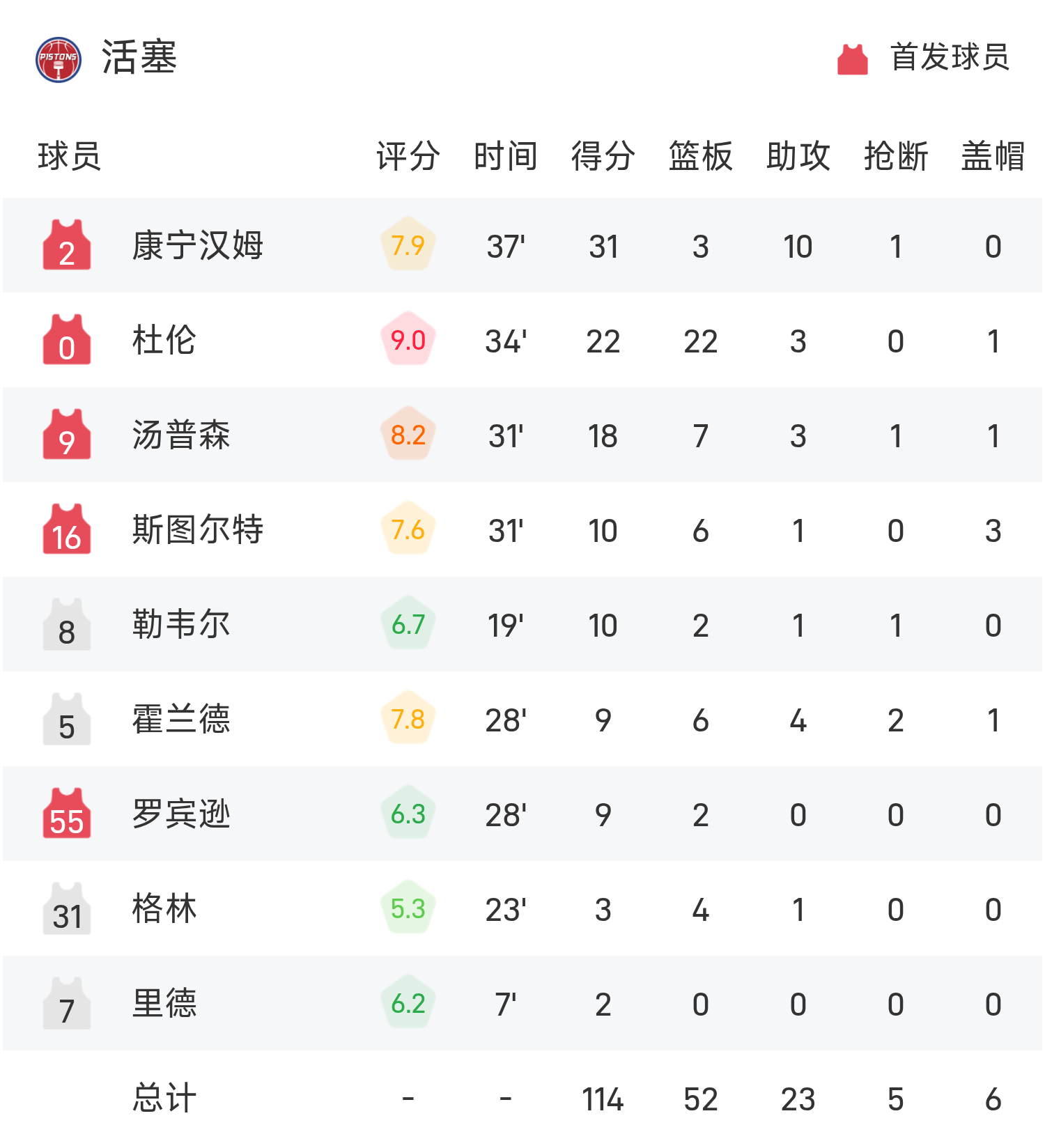 NBA战报:康宁汉姆31分10助,活塞114-103爵士