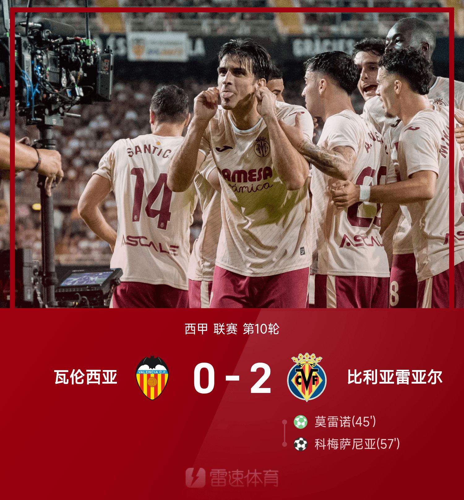 6686体育app10月26日讯 25/26赛季西甲联赛事第10轮,比利亚雷亚尔2-0战胜瓦伦西亚。第45分钟,莫雷诺造点并亲自主罚命中,300场里程碑破门;第57分钟,科梅萨尼亚跟进射门破门锁定胜局。
